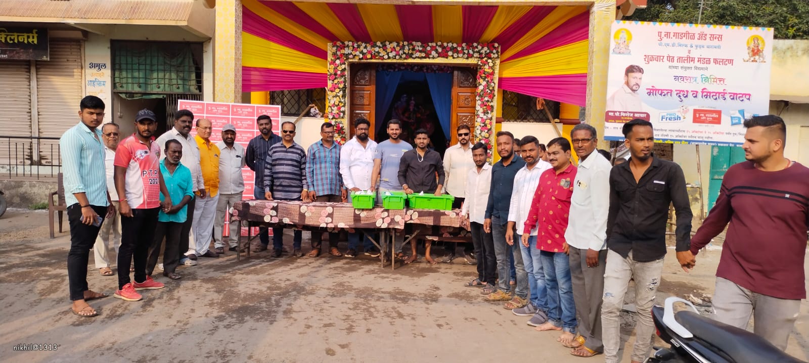 पी एन जी गाडगीळ अँड सन्स आणि पी एम डी मिल्क बारामती यांचे यांच्या सामाजिक बांधिलकीतून फलटण येथे पुना गाडगीळ अँड सन पी एम डी मिल्क & फुड्स बारामती व शुक्रवार पेठ तालिम मंडळ फलटण यांच्या संयुक्त विद्यमानाने नवरात्री उत्सवानिमित्त मोफत दुध व मिठाई वाटप चा कार्यक्रमाचा शुभारंभ पी एम डी मिल्क चे संस्थापक श्री हनुमंतराव मोहिते व शुक्रवार पेठ तालीम गणेशोत्सव मंडळाचे अध्यक्ष श्री फिरोज आतार मा. नगरसेवक, फलटणचे तहसीलदार श्री अभिजीत जाधव साहेब, फलटण नगरपरिषद फलटणचे सीओ श्री गायकवाड साहेब ,पुना गाडगीळ अँड सन्स चे श्री राजेश सोनी साहेब ,फलटण शाखा प्रमुख श्री इतापे साहेब व शुक्रवार पेठ तालीम मंडळ फलटण चे सर्व पदाधिकारी व कार्यकर्ते यांच्या हस्ते संपन्न झाला.